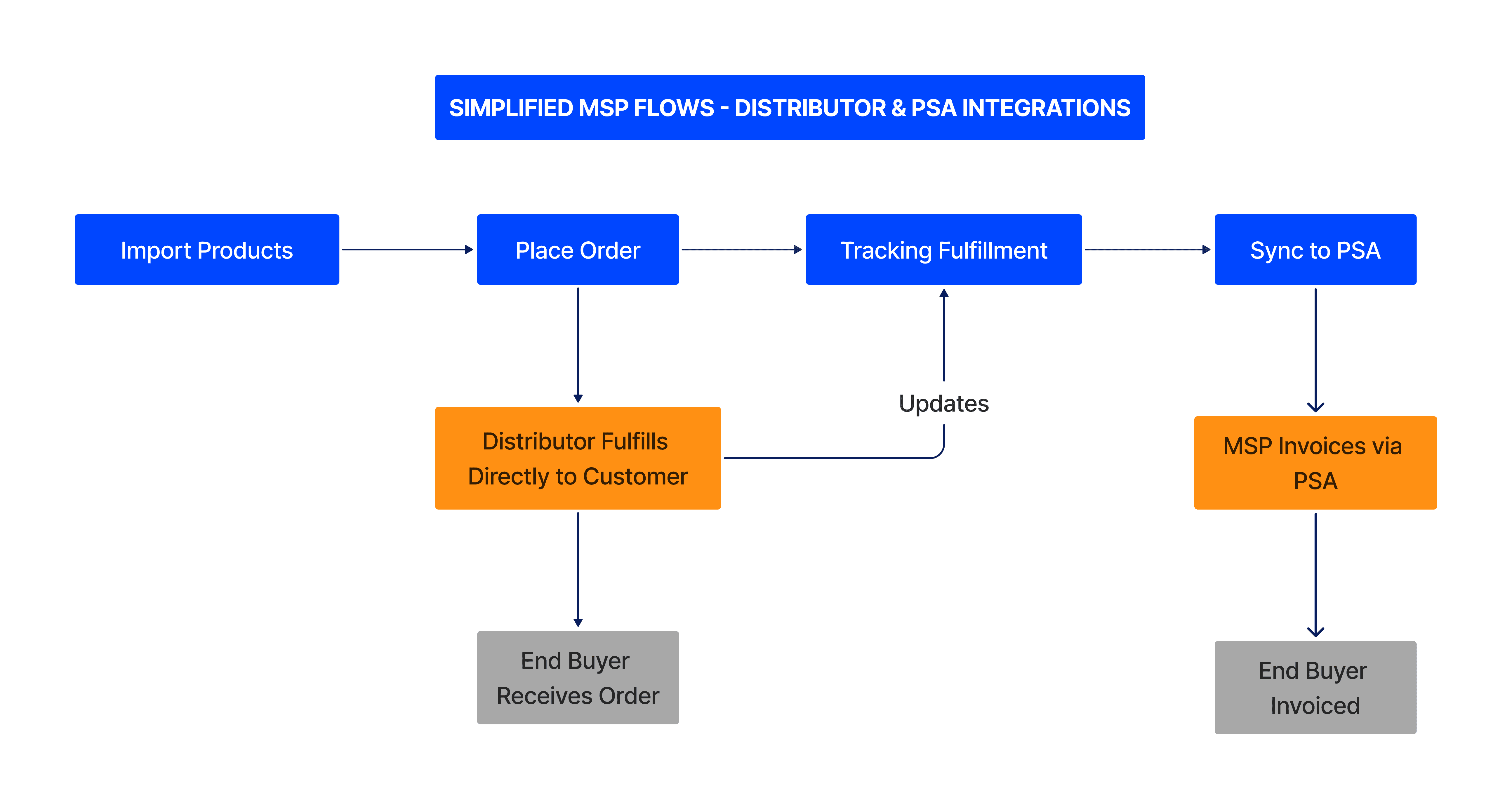 MSPs source hardware and software from distributors like TD Synnex and Ingram Micro, then track everything in PSA tools like ConnectWise. But purchases on distributor platforms don't sync to PSA systems. MSPs manually reconcile purchases, customers, and billing across multiple tools. It's slow, error-prone, and doesn't scale.